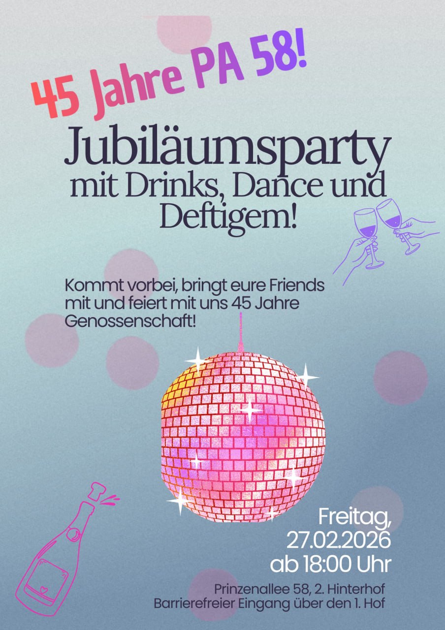 Nach diversen Krisensitzungen mit Vertretern des Bezirksamts, der Senatsbauverwaltung, gemeinnützigen Treuhändern selbstverwalteter Hausprojekte, Unterstützerinnen und BewohnerInnen wurde schließlich Ende des Jahres 1987 ein Gutachten von der Senatsbauverwaltung in Auftrag gegeben. Dieses Gutachten sollte untersuchen, ob und wie weil ein Engagement des Landes Berlin zur Erhaltung der Prinzenallee 58 begründbar wäre. Ferner sollten verschiedene Kauf- und Privatisierungsvarianten modellhaft berechnet werden. Die Ergebnisse sollten vier Wochen nach dem Prozeßtermin vorliegen – theoretisch konnten wir bis dahin schon geräumt sein. Letztlich wurde jedoch der Prozeßtermin verschoben und das Gutachten sprach eine klare Empfehlung aus, das Wohn- und Nachbarschaftsprojekt Prinzenallee aufgrund seiner beispielhaften Verbindung von Wohnen und sozial-kultureller Arbeit zu erhalten. Darüber hinaus wurden die beiden Modelle favorisiert, die wir selbst als Lösungsmöglichkeiten entwickelt hatten: Kauf des Hauses durch das Land Berlin, Weitergabe an einen gemeinnützigen Träger und Abschluß eines langfristigen Nutzungsvertrags mit unserem Bewohnerverein oder Übergabe des Hauses an eine von uns zu gründende Genossenschaft.